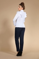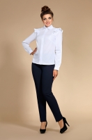 Комплект женский трех предметный , состоящий из блузы, сарафана и брюк. Блуза полуприлегающего силуэта из хлопка (не тянется). Застежка доверху , воротник рубашечного типа. Сарафан полуприлегающего силуэта на тонких бретелях без подкладки, выполнен из костюмно – плательной ткани. Застежка – на запах. Брюки классические на притачном поясе. Застежка – гульфик на молнии. По переднему и заднему полотнищу заутюжены стрелки. Выполнены из костюмно – плательной ткани.