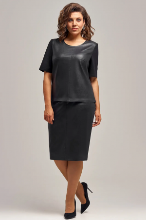 Комплект женский двухпредметный, состоящий из джемпера и юбки. Джемпер полуприлегающего силуэта. Перед выполнен из эко-кожи на замшевой основе. Рукава и спинка из мягкого трикотажного полотна. Вырез горловины круглый. Рукава втачные. Перед юбки выполнен из эко-кожи, спинка выполнена из мягкого трикотажного полотна. По бокам пояса резинка для лучшего прилегания. Застежка на петлю и пуговицу.