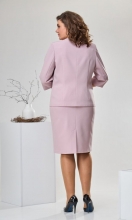 Костюм женский 2-х предметный жакет и юбка. Жакет полуприлегающего силуэта длиной ниже бёдер на 4 см. Перед с 2- мя рельефами выходящими из плечевых швов, на рельефах обработка, фигурный карманы с листочками с вточными концами. Левый карман декорирован пришитыми украшениями. Спинка со средним швом двумя талиевыми выточками. Горловина фигурная, обточенная без воротника. Застёжка центральная бортовая на 1- у обмётанную петлю и 1- у пeговицу. Край низа передана закруглён. Рукав вточной, двухшовный, длиной 3/4. Жакет на подкладке, с плечевыми накладками. Юбка "карандаш", длиной до середины колена. Переднее полотно с 2- умя фигурными карманами "обманками" с ниточками с вточными концами/ Длина жакета 60см, длина рукава 45, длина юбки 62см
