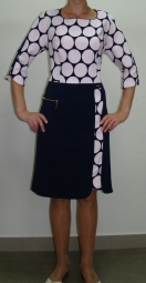 Выполнено из двух видов ткани: однотонного плотного трикотажа внизу и принтованного вверху. Модель асимметричная в нижней части. С одной стороны - горизонтальный подрез, имитирующий вход в карман, с декоративной молнией, с другой стороны - вертикальный подрез со вставкой из материала верхней части. Подрез по линии талии украшен металлическим логотипом. Верхняя част платья - по фигуре. Рукава втачные, слегка расширены к низу с фигурными краями и вставкой по центральной части рукава из однотона.