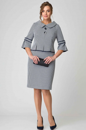 Платье женское нарядно-повседневное, полуприлегающего силуэта из плательной ткани. Рукав ¾, на манжете с бантовой складкой и патой с имитацией банта. V-образная горловина с отложным воротником. Платье на подкладке, с имитацией юбки и блузки. Верх платья по переду и по спинке со складками и окантованным низом. По центральному шву переда две отделочные пуговицы. Юбка платья классическая, зауженная к низу. По задней части в среднем шве шлица.