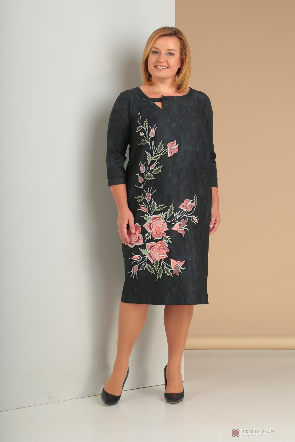 Платье выполнено из текстильного полотна "барби", дизайн которого имитирует вышивку. Актуальный прямой силуэт и длина чуть ниже колена скрывают недостатки фигуры. Модель дополняет небольшой разрез, оработанный внизу рельефа полочки. Вырез горловины асимметричный, декорирован небольшой перемычкой и пуговицами. Спинка со средним швом. Рукав длиной 3/4, с небольшой манжетой.