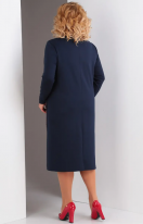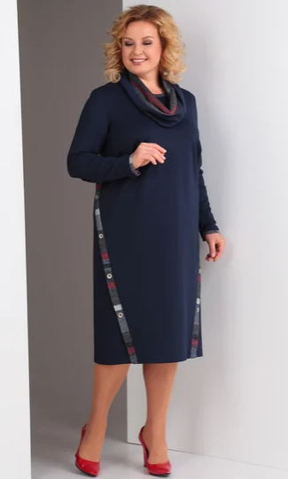 Женское платье универсальное и практичное, полуприлегающего силуэта, длиной ниже колена. Спинка со средним швом и боковые швы смещены в сторону переда, в которые вставляются отделочные планки с контрастной ткани. На планках пришиты пуговицы. На переде платья нагрудные выточки. Вырез горловины круглый. Рукав втачной одношовный. Понизу рукава и горловине отделочные планки с контрастной ткани. В комплекте ещё есть хомут с однотонной и контрастной ткани.