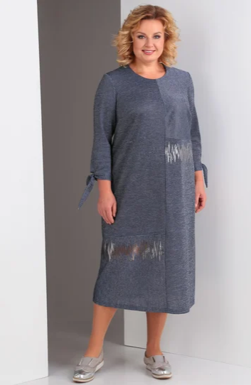 А-Образное платье универсальное и практичное, полуприлегающего силуэта, длиной ниже колена. На спинке платья есть средний шов. Перед платья со средним швом, нагрудными выточками и горизонтальными подрезами. Вырез горловины круглый. Рукав одношовный, втачной, длиной за локоть.