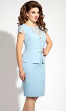 Платье женское прилегающего силуэта с отрезной линией талии и отлетной баской. По переду расположены нагрудные и талиевые вытачки и игурная вставка из кружева, идущая от горловины к талии.. По центру талиевого шва пришита декоративная фурнитура. На юбке под баской имеются талиевые вытачки. По спинке талиевые вытачки, средний шов со шлицей и застёжкой на потайную молнию. В области горловины игурная вставка из кружева. Под баской имеются талиевые вытачки. Рукав крылышко, выполнен из кружева. Длина рукава около 11см. Длина изделия 100-105см в зависимости от размера.
