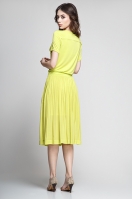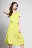 Платье женское, полуприлегающего силуэта с отрезным лифом и притачным поясом. Лиф и пояс – из трикотажного полотна, подол из штапеля на подкладке . Лиф переда с отделкой- «голограмма» по кокетке . На поясе- бант с голограммой. Горловина фигурная, окантовывается. Рукава одношовные втачные, короткие, низ окантовываются.