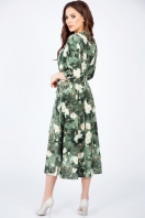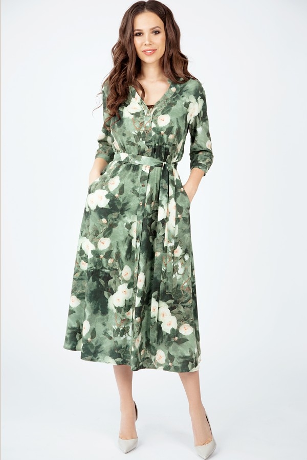 Платье женское полуприлегающего силуэта, без подкладки. Платье отрезное по линии талии, присборено на венгерку. На лифе переда обработаны вытачки, идущие от проймы. На левой полочке фигурный нагрудный карман. Застежка планка на 10 петель-пуговиц. Рукава втачные. Низ рукава обработан притачной манжетой, застегивающейся на петлю-пуговицу. К платью прилагается съемный пояс-шнурок. Длина платья - 122 см (±2) Длина рукава - 40 см (±2) Ткань - шифон-стрейч
