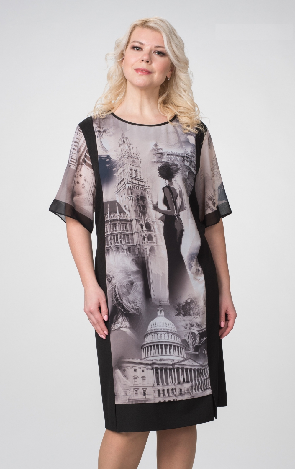 Стильное платье свободной формы. На полочке имеется декоративный фотопринт "город", придающий изделию оригинальный вид. В рельефных швах по переду выполнены разрезы. Рукав свободной формы. Платье идеально подойдет для женщины с любым типом фигуры. Длина изделия по спинке - 101 см; рукава короткие.