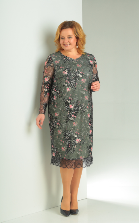 Платье средней длины подчеркивающее фигуру выполнено из ажурной сетки. Рукав длинный. По низу платье украшено «французским» кружевом.