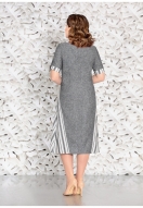 Платье трапециевидного силуэта выполнено в повседневном стиле из однотонной и набивной ткани (ткань с рисунком полоской). Платье с втачными короткими рукавами и притачными манжетами, по центру которых пришиты паты с декоративными пуговицами. Планка горловины, манжеты, вставки по бокам, а также накладной карманчик, настроченный по переду платья, выполнены из отделочной ткани. На нагрудном кармане также есть декоративная пата с пуговицей. Подрезы и по бокам платья визуально стройнят фигуру и делают платье более интересным. По переду к подрезам притачены планки, которые позволяют дополнить платье «игрой» полоски, на них для декора пришиты пуговицы. По спинке средний шов с потайной застежкой молнией, подрезы и талиевые вытачки. Отличное платье на каждый день!