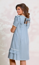 Кокетливое платье, А-образного силуэта. По переду расположены вертикальные рельефы со вставленными рюшами в верхней части. Центральная часть переда с подрезом выше линии талии и настроченным кружевом, на бочках внизу расположены горизонтальные подрезы с рюшами и кружевом. Горловина округлой формы. Оформлена декоративной планкой с пришивными белыми стразами и кружевом. По спинке расположены рельефы, бочки повторяют перед, линия горловины переходит в фигурный вырез, с резинкой по нижнему срезу, вверху завязывается бант. В боковых швах расположены карманы. Рукав втачной с вставленной рюшкой по окату, низ рукава оформлен кружевом. Длина рукава 22 см. Длина платья 99 см.