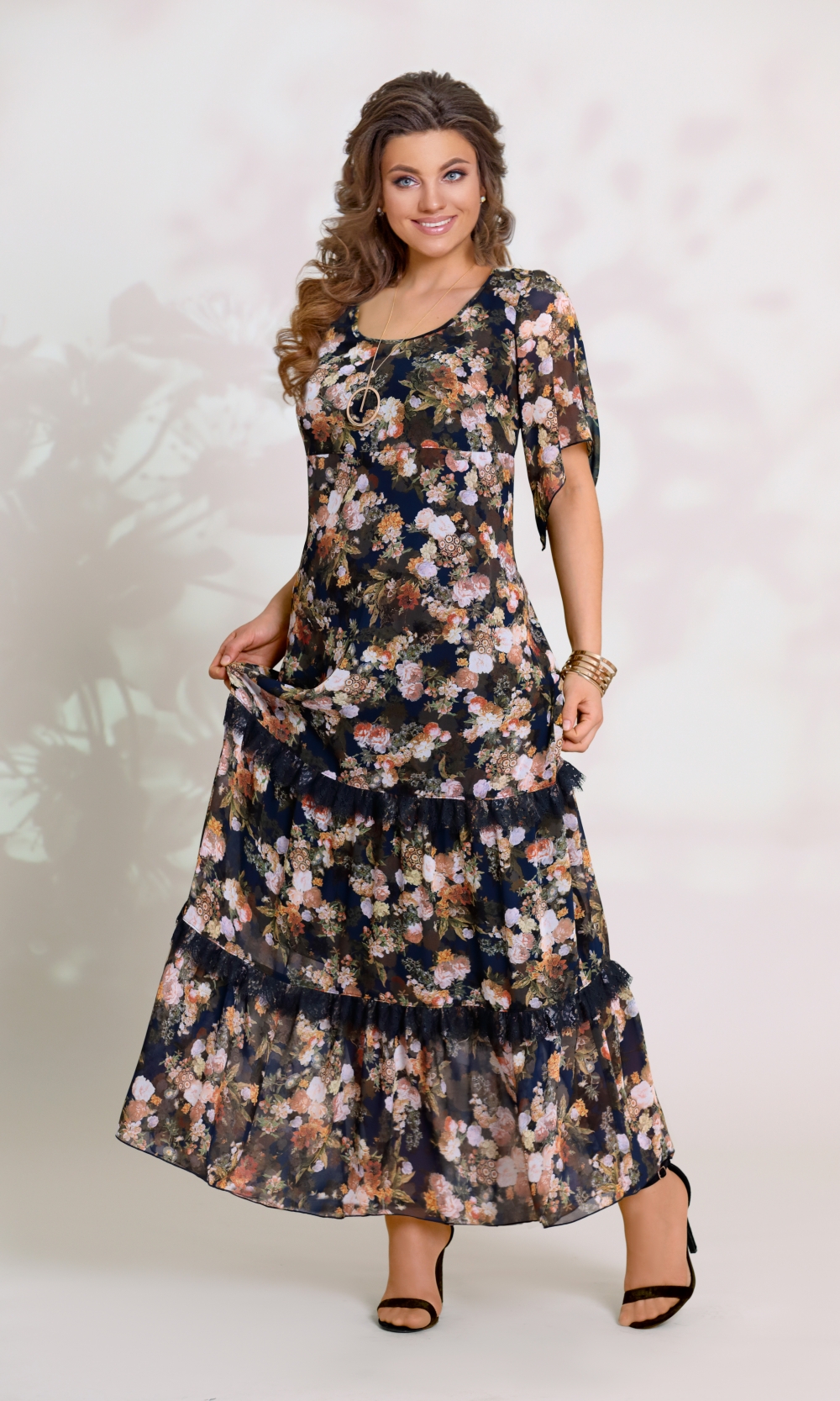 Вау, какой цветочный принт! Эти цветочки точно поднимут настроение - вы не только самая стильная, но еще и заряжающая всех на позитив. Отрезная талия удлиняет фигуру, а расширенный к низу силуэт добавляет комфорт. Платье из шифона на подкладке. По переду расположены нагрудные вытачки, подрез чуть выше талии, притачные воланы со сборкой и кружевом. Вырез горловины округлой формы. По спинке расположены воланы со сборкой и кружевом. Рукав втачной, расширенный с фигурным низом. Длина рукава 31 см. Длина платья 138 см.